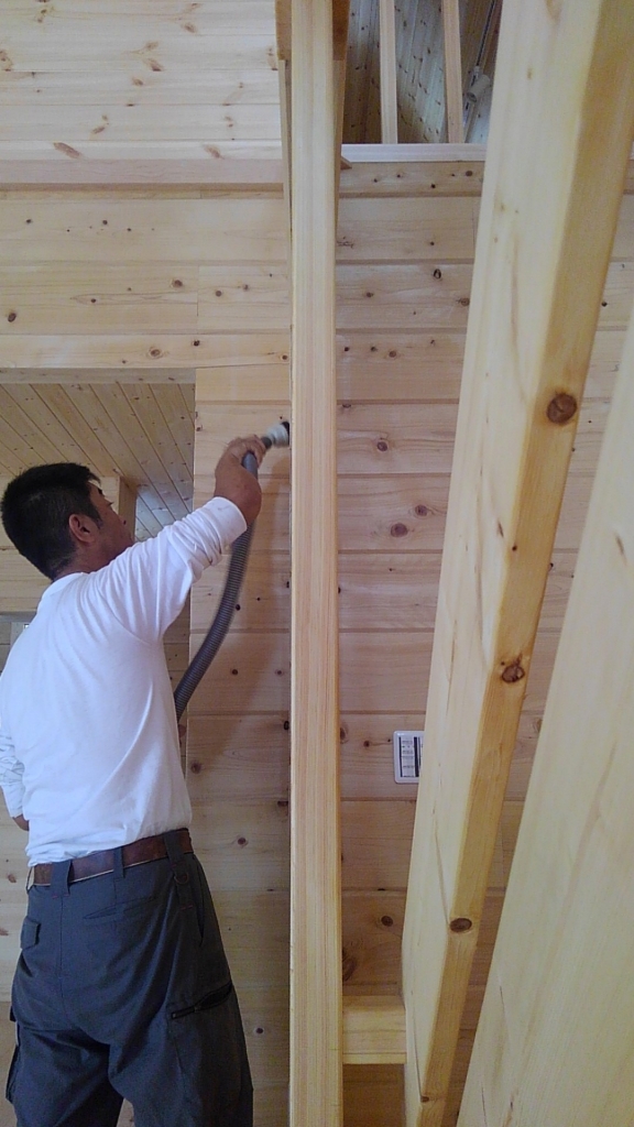 電気の森重さんはコアでログ壁に穴あけ中・・・。