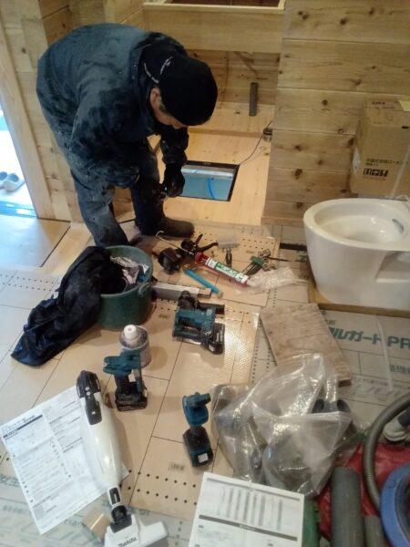 天井が張り終わり、1Fの間柱の施工も終わり床張り作業に入ります。
