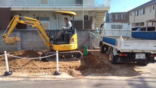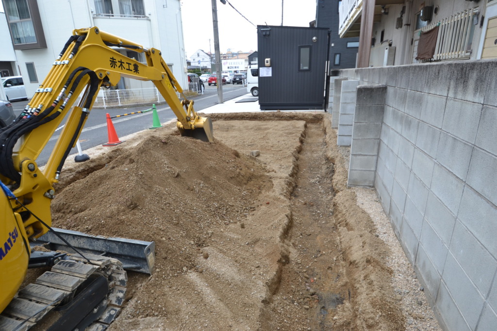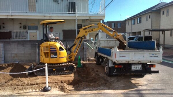岡山市南区で新築ログハウスの基礎工事が始まりました。 道路後退(セットバック)制限があるため、かなり奥行の無い建物になります。 2方が公道のため、かなり気を使います。 トラックを横付けにして掘方で出た残土を2トントラックに積み込みます。