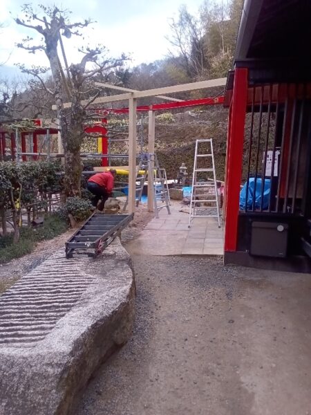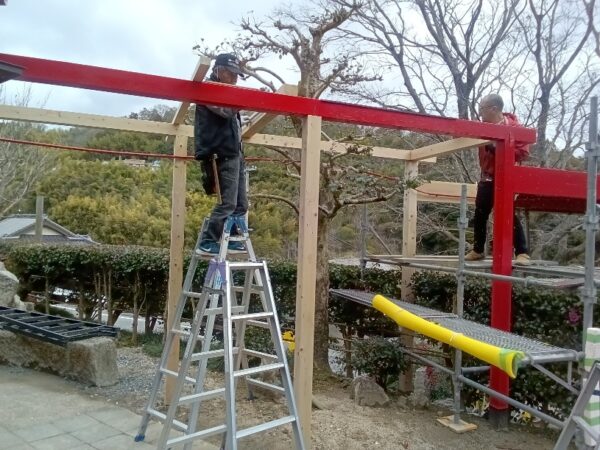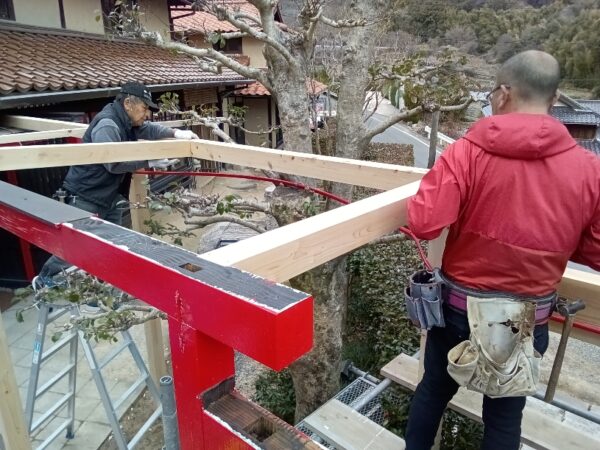 現在、大工による解体が終わり、傷んだ柱、梁の改修工事が始まりました。
