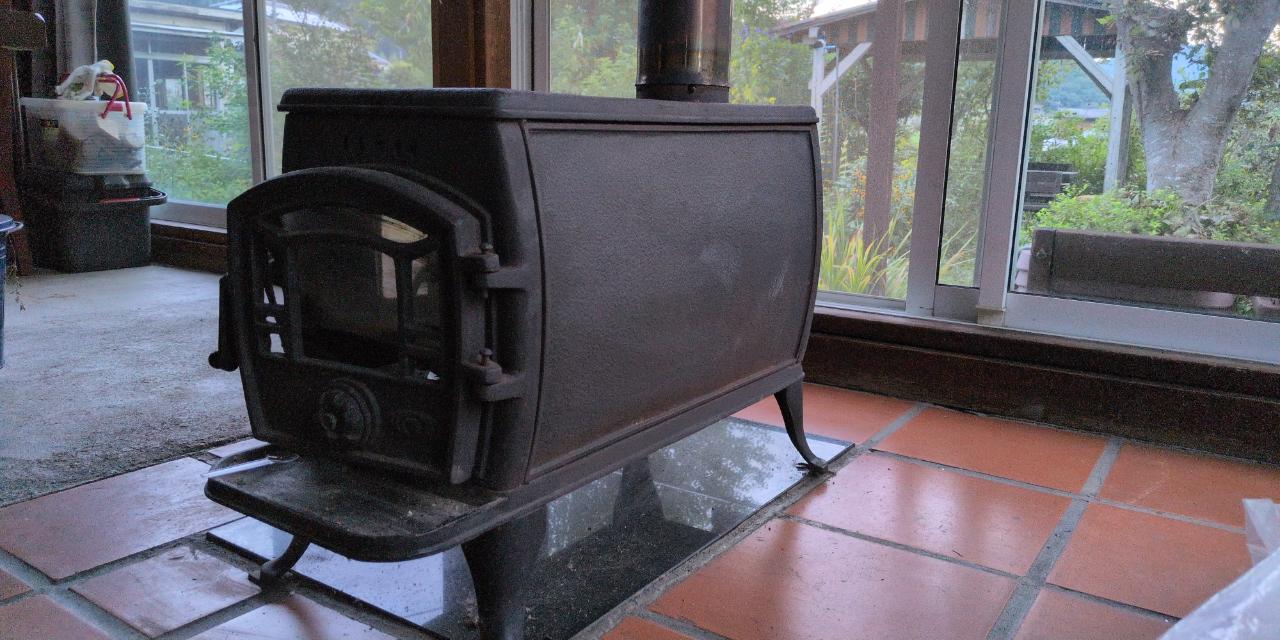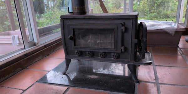 母屋の薪ストーブの投入ガラスが割れていたので、補修させて頂きました。