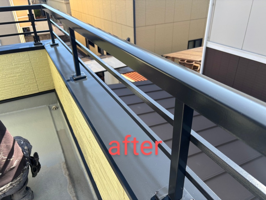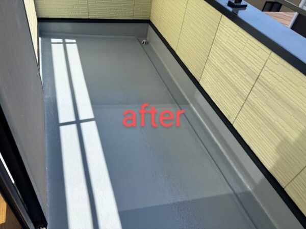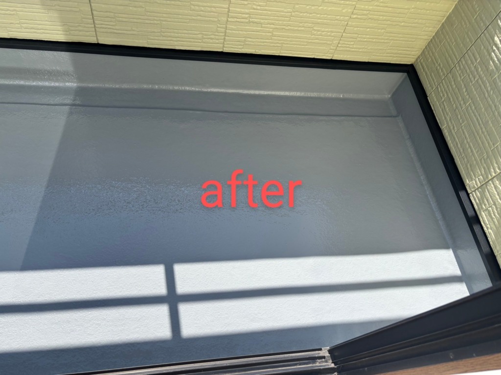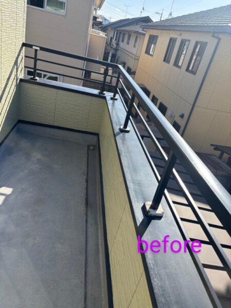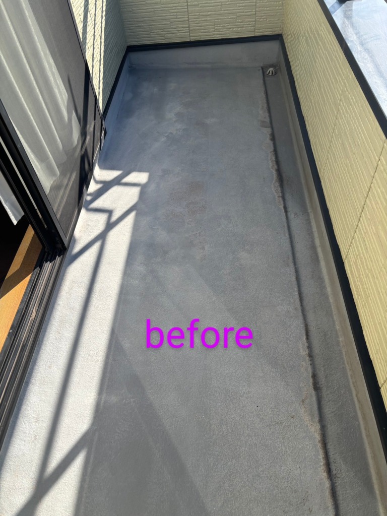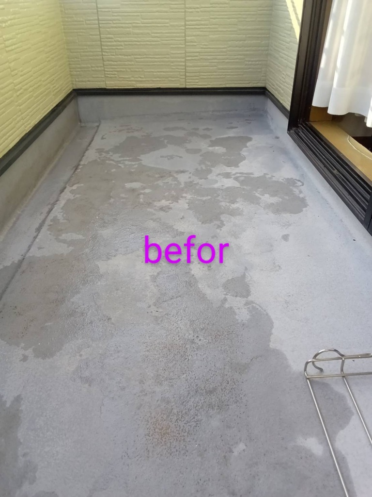約半年前にOB顧客様からのご紹介頂いたお客様の案件です。 築26年のハウスメーカー木造在来工法の住宅です。 2Fベランダの塗装のご依頼でした。 新築依頼一度もメンテナンスはされていませんでした。 ①床の塗装の一部が劣化して下地のFRPが少し見えるところがありました。 ②手摺の笠木(ガルバリウム)の一部塗装が剥がれ、全体的にくすんでいました。 ↓こちらが塗装前