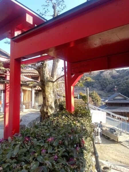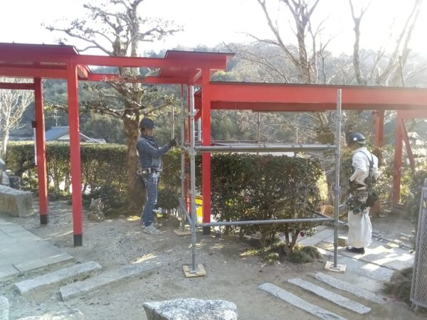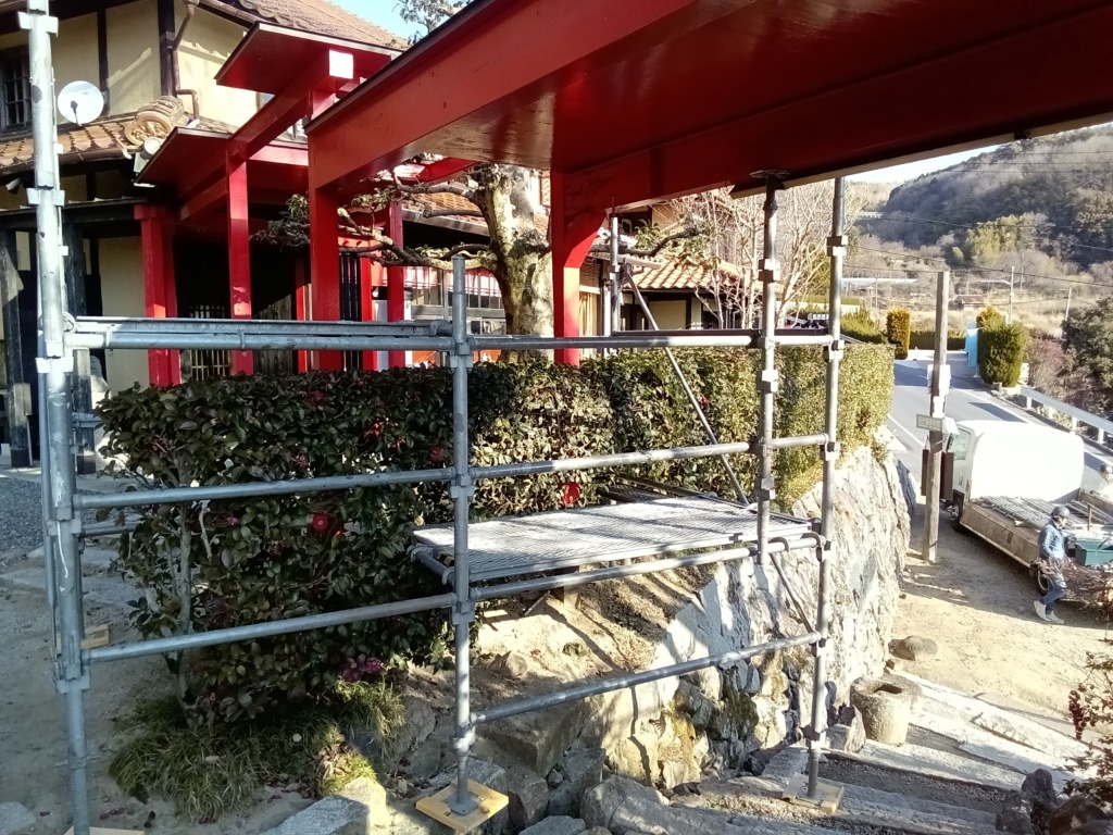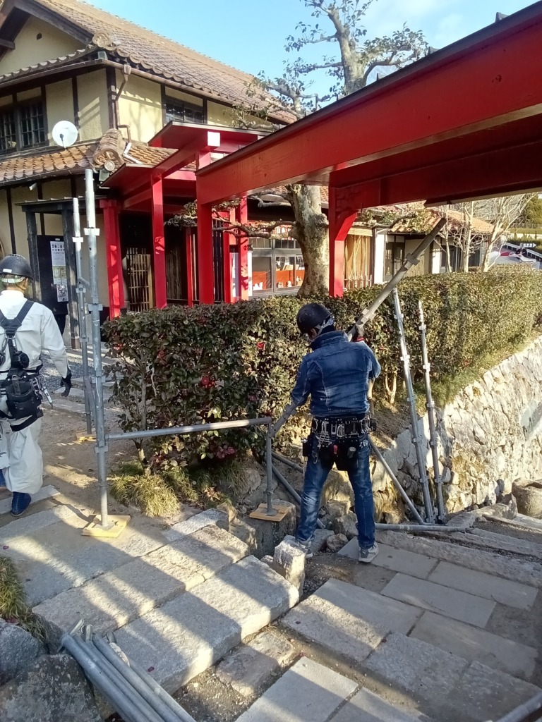 ほぼ1年前にご依頼頂いた「招き猫美術館」の改修工事が始まりました。 ご縁は2年前にお世話になっている土木業者様からのご紹介で、昨年 おみくじ堂の修復工事をさせて頂いたのが始まりです。 今回は鳥居の梁が腐った部分と、その周りの屋根、通路の修復工事です。 ↓こちらが傷んだ梁です。 先日足場を組みました。